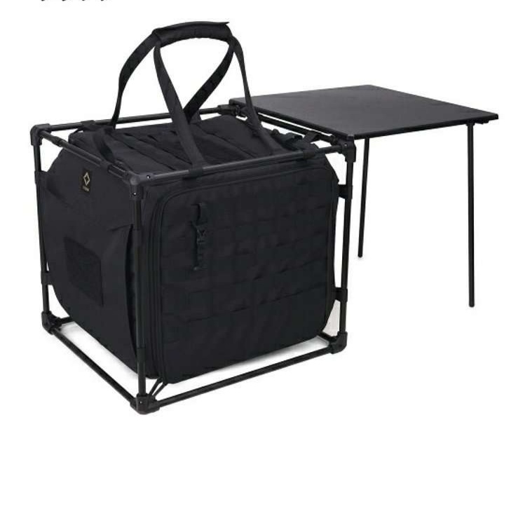 大容量の収納スペースにキャンプ道具をすっきりと片付けられると同時に、サイドにはテーブルスタンドが展開できる多機能さが魅力です。
