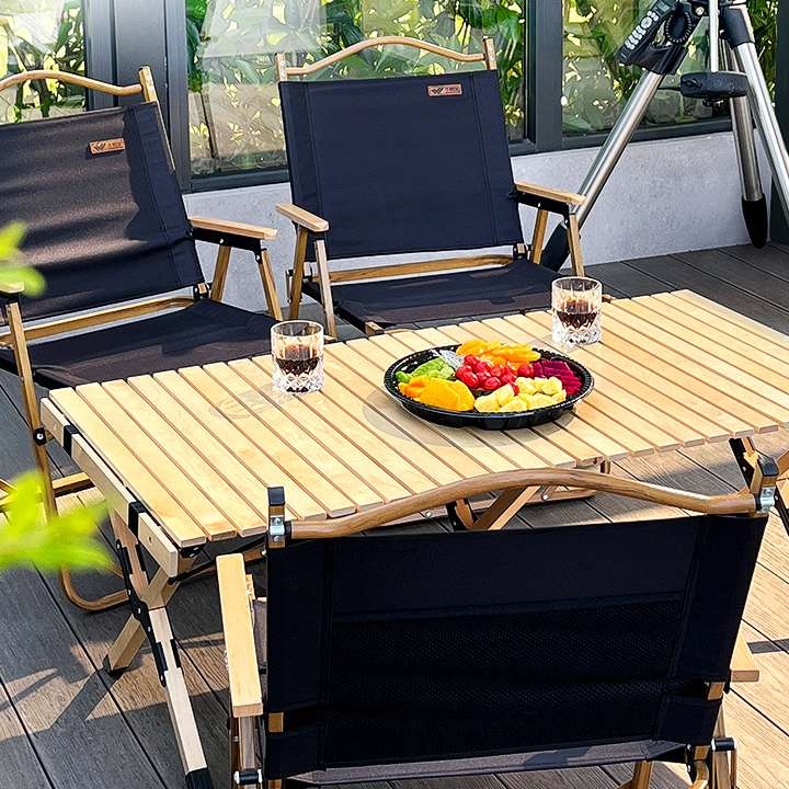 ナチュラルな木目が温かみを感じさせ、庭での食事やキャンプサイトでのくつろぎタイムを演出します。