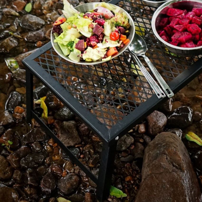 天板にメッシュ素材を採用しているため焚き火台の上に設置して調理台としても使える優れもの。