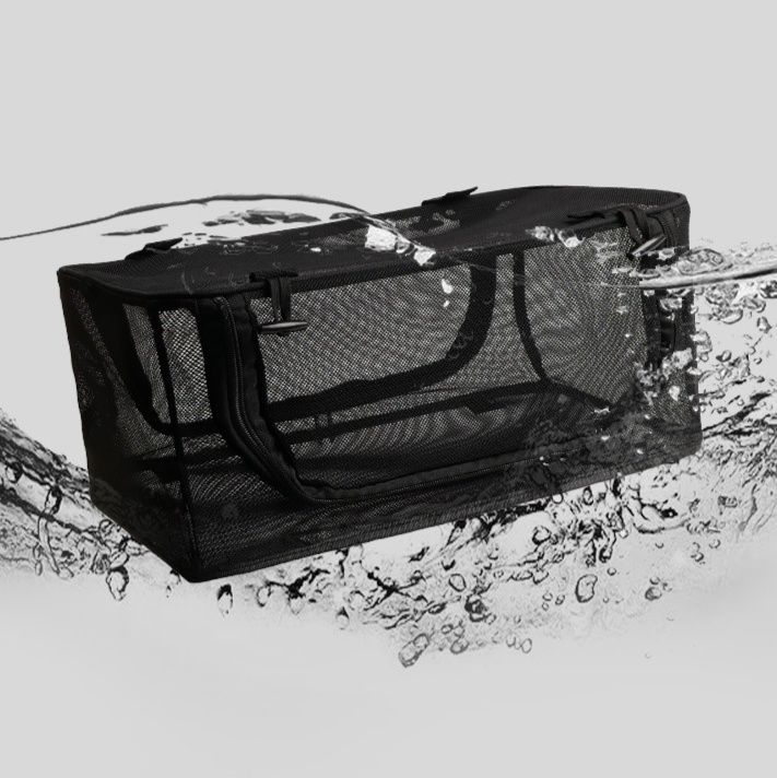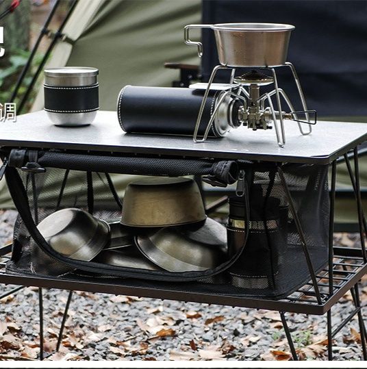 天板下には調理器具や食器を整理できるメッシュ棚と収納袋が付属し、限られた空間を有効活用できます。