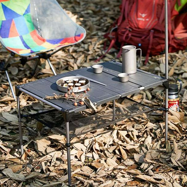 軽量なアルミ製のアウトドアテーブルは、コンパクトな構造を採用し、持ち運びが簡単。ローテーブルとしての最適な高さ設計により、キャンプやピクニックでの食事や作業が快適に行える。さらに、メッシュ棚付きで小物の収納もでき、整理整頓もバッチリ。自然の中でのひとときをより楽しむための必須アイテム。