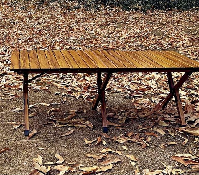 耐久性抜群のアルミ製フレームと上質な木目調天板を組み合わせた折りたたみ式アウトドアテーブル。