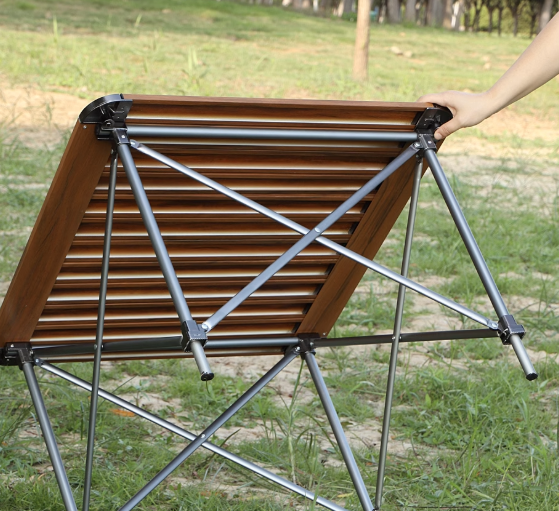 高級感あふれる木目調の天板を持つ折りたたみアウトドアテーブル。軽量設計で持ち運びも楽々。キャンプやピクニックに最適で、食事やくつろぎのひとときを優雅に演出します。使わないときはコンパクトに収納でき、アウトドアシーンをさらに特別なものにしてくれます。どんな場所でも活躍する一品です。