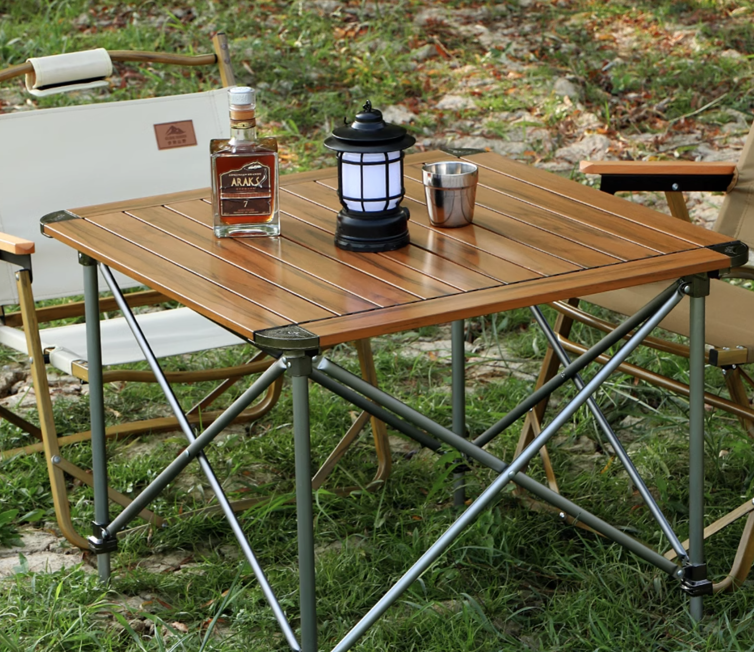モダンで落ち着いた雰囲気のテーブルは、キャンプシーンを上質に演出